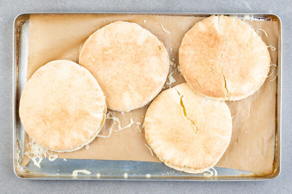 4 Pitabrote mit einigen Tropfen Wasser befeuchten, dann gleichmäßig mit dem Käse füllen. Auf einem mit Backpapier ausgelegten Backblech 4–5Min. im Ofen erwärmen, bis der Käse geschmolzen ist, die Brote sollen aber nicht zu knusprig werden. Tipp: Das übrige Brot kann eingefroren werden.