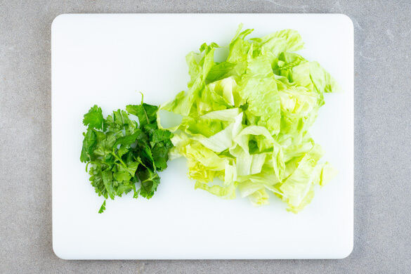 Den Salat in feine Streifen schneiden. Den Koriander samt Stängeln fein schneiden.