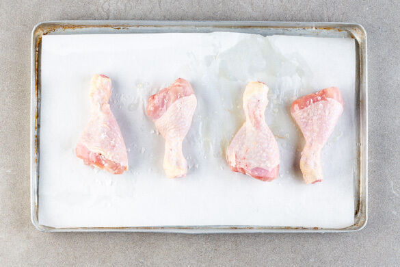 Die Drumsticks mit etwas Küchenkrepp trocken tupfen, dann rundum mit 2EL Pflanzenöl und 1 Prise Salz einreiben. Auf einem mit Backpapier ausgelegten Backblech ca. 15Min. im Ofen vorbacken.