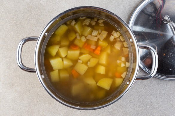 Die Karotten, den Knoblauch und die restlichen Zwiebeln in einem mittelgroßen Topf mit 1EL Pflanzenöl und der restlichen Gewürzmischung bei mittlerer Hitze ca. 2Min. anbraten. Die Kartoffeln mit 200ml Wasser dazugeben und das Brühgewürz unterrühren. Das Gemüse abgedeckt ca. 10Min. garen.