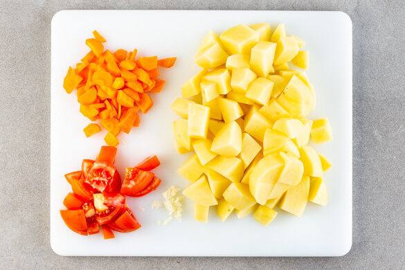 Den Backofen auf 240°C (220°C Umluft) vorheizen. Die Kartoffeln und grob würfeln. Die Karotte ggf. schälen, längs halbieren und in dünne Scheiben schneiden. Die Tomate grob würfeln. Den Knoblauch schälen und ebenfalls grob würfeln.