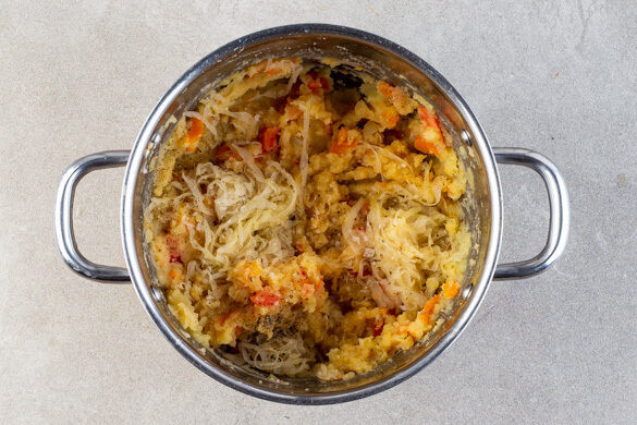 Die 1/2 des Sauerkrauts in einem Sieb abspülen. Mit den Tomaten zum Gemüse in den Topf geben und das Gemüse noch 5–10Min. garen, bis die Kartoffeln durch sind. Das Gemüse zu einem groben Püree stampfen und mit Salz und Pfeffer abschmecken. Die Drumsticks auf dem Kartoffel-Sauerkraut-Stampf anrichten, mit der restlichen gewürfelten Peperoni garnieren und servieren.