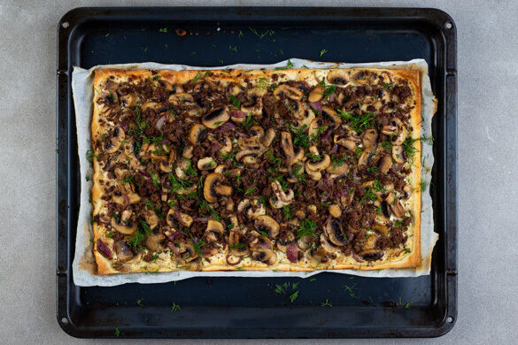 Ob klassisch mit Speck und Zwiebeln oder süß mit Apfel und Zimt: Flammkuchen gibt es in unzähligen Variationen. Bei unserer heutigen Kreation bestreichst du den knusprigen Teig mit einer mild-würzigen Basis aus körnigem Senf und Crème fraîche. Oben drauf kommen gebratenes Rinderhackfleisch, frische Champignons und aromatischer Dill. Dazu servierst du einen gemischten Salat mit leichtem Schnittlauchdressing. Bon appétit!