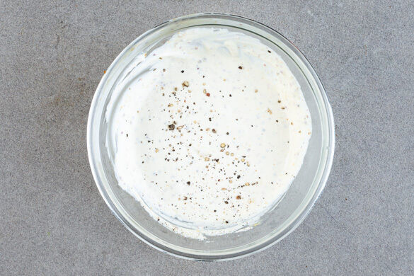 Die Crème fraîche mit dem Senf und je 1 Prise Salz und Pfeffer verrühren.