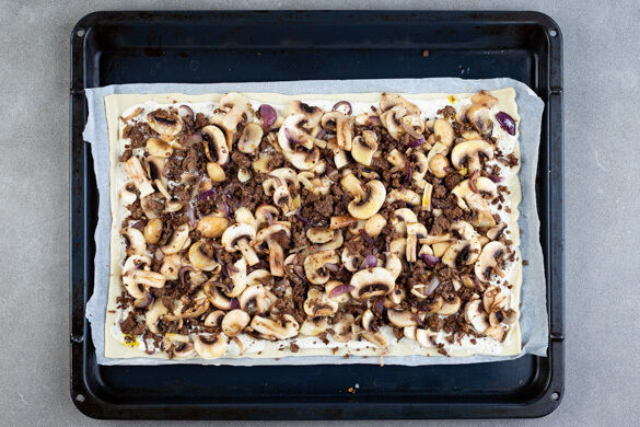 Den Teig mit dem Papier nach unten auf einem Backblech ausrollen und gleichmäßig mit der Senfcreme bestreichen. Erst das Hackfleisch, dann die Pilze darauf verteilen und den Flammkuchen 12–15Min. im Ofen auf der untersten Schiene backen.