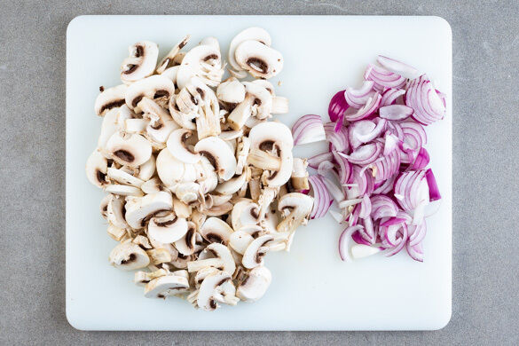 Den Backofen auf 210°C Ober-/Unterhitze vorheizen. Die Pilze ggf. säubern und in dünne Scheiben schneiden. Die Zwiebel schälen, halbieren und in feine Streifen schneiden.