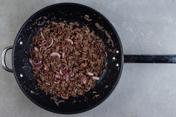 Das Hackfleisch mit den Zwiebeln in einer großen Pfanne mit 1EL Olivenöl bei starker Hitze krümelig 4–5Min. anbraten. Mit je 1 kräftigen Prise Salz und Pfeffer würzen.