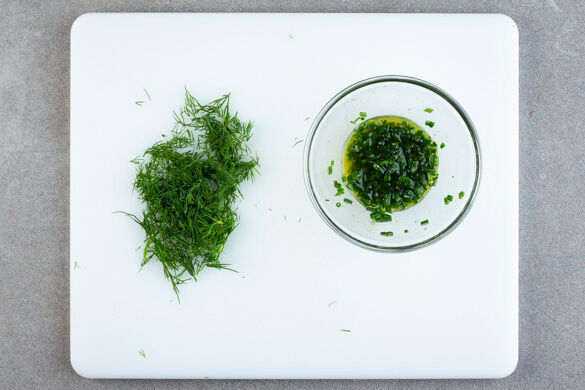 Inzwischen den Dill samt Stängeln fein schneiden. Den Schnittlauch in kleine Röllchen schneiden. Je 1EL Olivenöl, Essig und Wasser mit 1/2TL Salz und 1 Prise Pfeffer zu einem Dressing verrühren und den Schnittlauch untermengen.