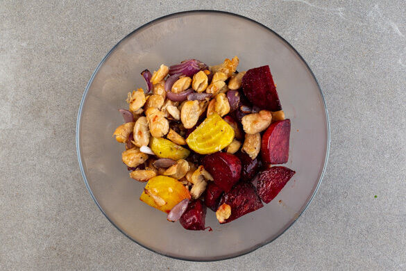 Den Schinken auf das Gemüse legen und alles im Ofen 6–7Min. backen, bis der Schinken goldbraun und knusprig ist. Den Schinken herausnehmen und abkühlen lassen. Die Bohnen mit den Beten und den Zwiebeln vermengen und weitere 18–19Min. backen, bis die Beten gar sind.