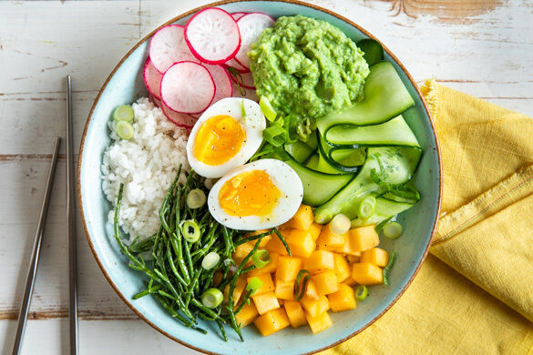 Du fragst dich, was das Besondere an Avocados ist? Wir geben dir gleich 4 gute Gründe, die Powerfrucht noch heute zu genießen: Sie ist reich an ungesättigten Fettsäuren, enthält viel Kalium und Ballaststoffe – und sie ist einfach super lecker! Mit fruchtiger Kaki, knackigem Queller und Radieschen sowie einem wachsweich gekochten Ei hat die bunte Bowl aber noch mehr zu bieten. Lass es dir schmecken!