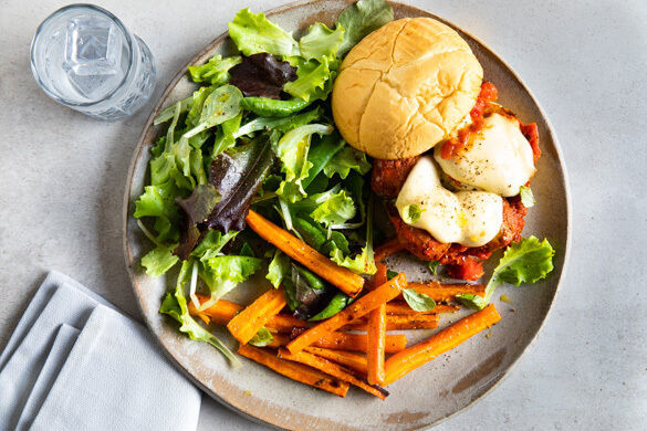 So ein herzhafter Veggie-Burger ist doch was Feines! Leckere, vegane Hackbällchen, cremiger Mozzarella und aromatische Knoblauchbutter im Briochebrötchen, dazu Karottenpommes und ein Tomatendip mit frischen Kräutern und einen knackigen Salat. Happs – da kann keiner widerstehen!