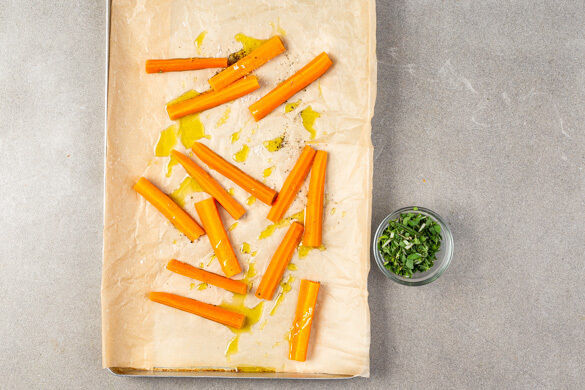 Den Backofen auf 240°C (220°C Umluft) vorheizen. Die Karotten ggf. schälen und je nach Dicke der Länge nach vierteln oder sechsteln. Die Oreganoblätter und die Rosmarinnadeln abzupfen und fein schneiden.