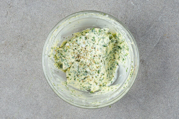 Den Ofen auf 250°C Grillstufe oder Oberhitze umstellen und das Blech mit den Karotten auf die unterste Schiene schieben. 2EL zimmerwarme Butter mit dem restlichen Knoblauch und den restlichen Kräutern verrühren und gut mit Salz und Pfeffer würzen.