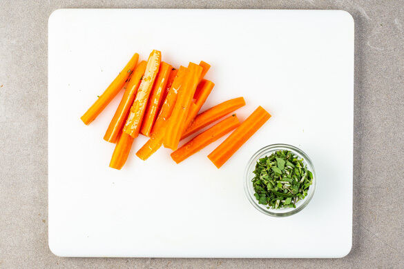 Den Backofen auf 240°C (220°C Umluft) vorheizen. Die Karotten ggf. schälen und je nach Dicke der Länge nach vierteln oder sechsteln. Die Oreganoblätter und die Rosmarinnadeln abzupfen und fein schneiden.