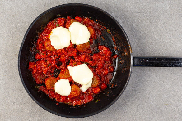 In einer großen Pfanne 1EL Olivenöl bei mittlerer Hitze erwärmen. Die 1/2 des Knoblauchs, die Tomaten, 2TL Balsamico sowie je 1 Prise Zucker, Salz und Pfeffer zugeben und die Sauce 4–8Min. leicht einköcheln lassen. Das Basilikum unterrühren und die Hackbällchen in 2 Gruppen in die Sauce geben. Mit dem Käse belegen und abgedeckt auf niedrigster Stufe ziehen lassen.