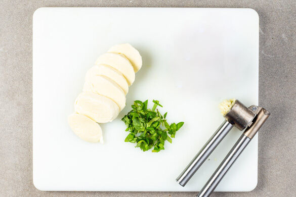 Das Basilikum samt Stängeln fein schneiden. Den Knoblauch durch eine Presse drücken oder sehr fein würfeln. Den Mozzarella in ca. 1cm dicke Scheiben schneiden.