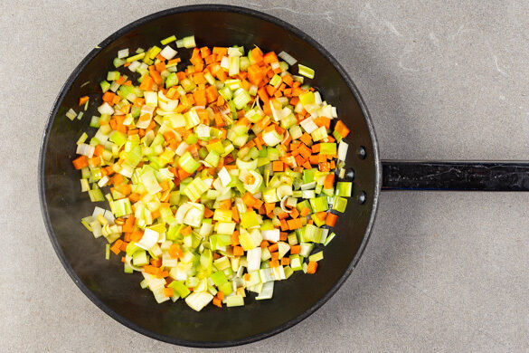 Den Gemüsemix in einer mittelgroßen Pfanne mit 1EL Olivenöl bei starker Hitze abgedeckt ca. 5Min. garen, dabei ab und an umrühren.