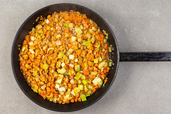 Die 1/2 des Tomatenmarkdie Sonnenblumenkerne, den Bulgur und die Brühe zum Gemüse in die Pfanne geben und alles gut verrühren. Abgedeckt bei niedriger Hitze 10–15Min. sanft köcheln lassen, bis der Bulgur die Flüssigkeit aufgesaugt hat und gar ist.