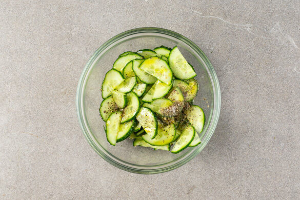 Die Gurke längs halbieren und quer in dünne Scheiben schneiden. Je 2EL Olivenöl und Essig mit 1/2TL Salz und je 1 kräftigen Prise Pfeffer und Zucker zu einem Dressing verrühren und die Gurken untermengen.