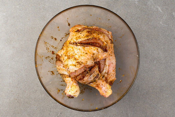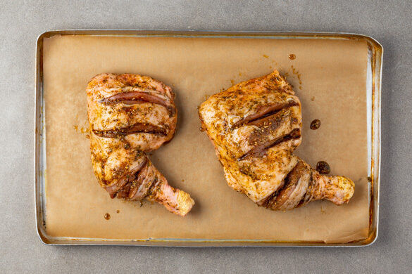 Den Backofen auf 230°C (210°C Umluft) vorheizen. Die Hähnchenschenkel trocken tupfen und jeweils 2–3-mal bis auf den Knochen einschneiden. Die Hähnchenschenkel rundum mit 2EL Olivenöl, der 1/2 der Gewürzmischung und 1/2 Salz einreiben.