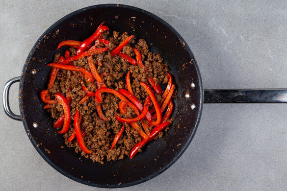 Die Paprika in einer mittelgroßen Pfanne mit 1EL Olivenöl und 1 Prise Salz bei mittlerer bis starker Hitze ca. 3Min. anbraten, dabei gelegentlich umrühren. Dann das Hackfleisch und 1 Prise Gewürzmischung zugeben und bei mittlerer Hitze unter ständigem Rühren ca. 5Min. braten, bis das Fleisch krümelig und gar ist. Mit Salz, Pfeffer und ggf. mehr Gewürzmischung abschmecken.