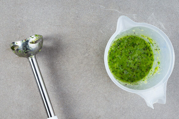 Die Kiwis schälen und grob würfeln. Die Limette halbieren und auspressen. Die 1/2 der Korianderblätter abzupfen und für die Garnitur aufbewahren. Den übrigen Koriander samt Stängeln mit den Kiwiwürfeln, 1TL Limettensaft und 1 kräftigen Prise Salz in einem hohen Gefäß pürieren. Die Salsa mit Salz und Pfeffer sowie ggf. 1 Prise Zucker abschmecken.