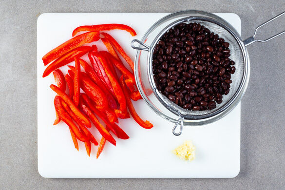 Den Backofen auf 240°C (220°C Umluft) vorheizen. Die Bohnen in einem Sieb kalt abspülen und abtropfen lassen. Die Paprika halbieren, entkernen und dünne Streifen schneiden. Den Knoblauch schälen und grob würfeln.
