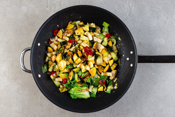 Die Zucchini und die weißen Pak-Choi-Streifen in einer großen Pfanne mit 2–3EL Pflanzenöl bei starker Hitze 2–3Min. anbraten. Den Knoblauch und den Ingwer zugeben und 1Min. mitbraten, dann die Sojasauce und die 1/2 der Chilipaste unterrühren und alles weitere 1–2Min. braten. Die grünen Pak-Choi-Streifen hinzufügen und 2–3Min. mitbraten.