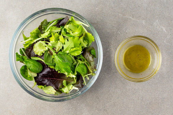 Die Zwiebelmarmelade, die Tomaten, die Kernmischung und den restlichen Estragon in den Topf geben und für 2–3Min. köcheln lassen. Nach Geschmack mit Salz und Pfeffer würzen. Aus 1EL Olivenöl, 1EL Essig und 1EL Wasser ein Dressing anrühren und mit Salz, Pfeffer und Zucker abschmecken. Das Dressing mit dem Salat vermengen.