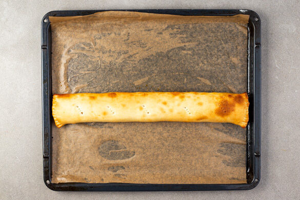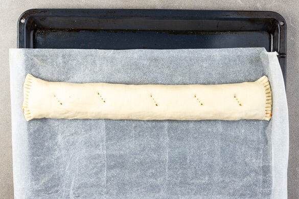 Den Teig mit dem Papier nach unten auf einem Backblech ausrollen. Das Hack auf den Teig geben und zu einer Rolle formen, die fast so lang wie der Teig ist. Dann mit dem Teig aufrollen und mit der Naht nach unten samt Papier auf das Blech legen. Überstehenden Teig an den Enden mit einer Gabel fest drücken, die Rolle 4–5 Mal einstechen und ca. 20Min. im Ofen backen.