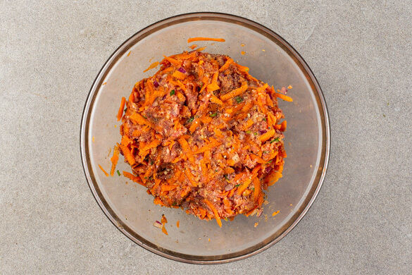Das Hackfleisch mit der 1/2 der Zwiebeln, dem geschnittenen Estragon, den Karotten und der Worcestershiresauce vermengen. Mit den Händen gut durchkneten und mit je 1 Prise Salz und Pfeffer würzen.