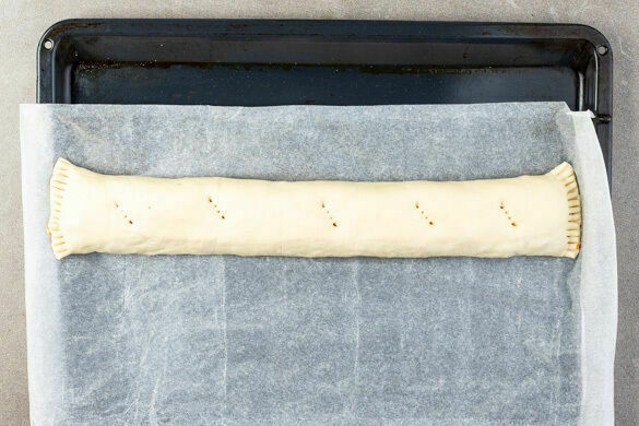 Die Teige mit dem Papier nach unten ausrollen. Je die 1/2 des Hacks auf die Teige geben und zu Rollen formen, die fast so lang wie die Teige sind. Die Teige aufrollen und jeweils mit der Naht nach unten samt Papier auf ein Backblech legen. Überstehenden Teig an den Enden mit einer Gabel fest drücken, die Rollen 4–5 Mal einstechen und ca. 20Min. im Ofen backen.