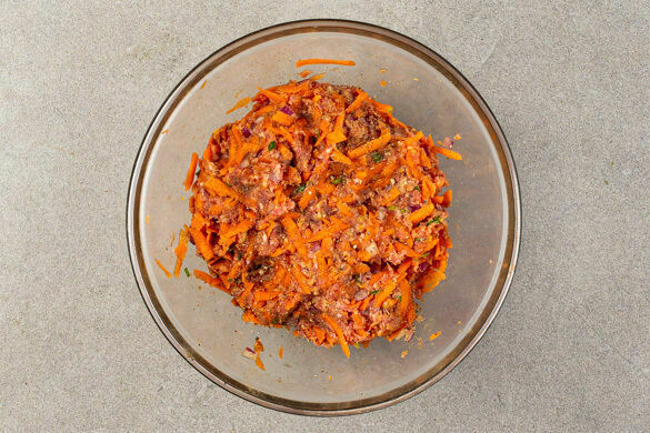Das Hackfleisch mit der 1/2 der Zwiebeln, dem geschnittenen Estragon, den Karotten und der Worcestershiresauce vermengen. Mit den Händen gut durchkneten und mit je 1 kräftigen Prise Salz und Pfeffer würzen.