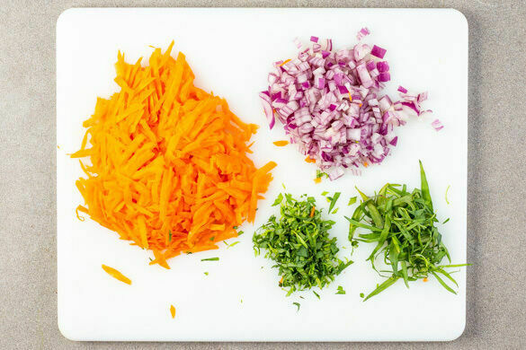 Den Backofen auf 220°C (200°C Umluft) vorheizen. Die Karotten ggf. schälen und mit einer Küchenreibe grob raspeln. Die Zwiebel schälen, halbieren und grob würfeln. Die Estragonblätter von den Stängeln zupfen und die 1/2 der Blätter in sehr feine Streifen schneiden.