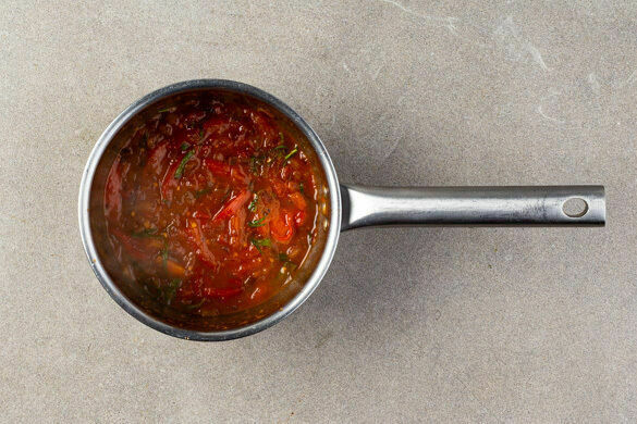Die Tomaten vierteln und entkernen, die Kerne aufbewahren und das Fruchtfleisch in dünne Streifen schneiden. Die Tomatenkerne mit 2EL Olivenöl und 2EL Essig in ein hohes Gefäß geben und mit einem Stabmixer pürieren. Die restlichen Zwiebeln mit 1EL Olivenöl in einem kleinen Topf 1–2Min. bei mittlerer bis hoher Hitze anbraten.