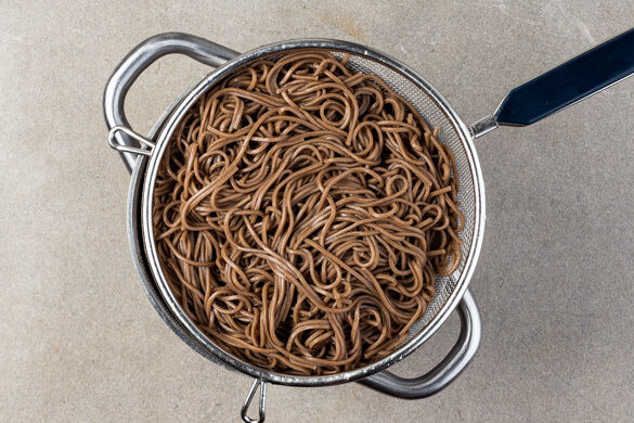 2/3 der Nudeln in das kochende Wasser geben und in ca. 4Min. bissfest kochen. In ein Sieb abgießen, die Nudeln sehr gründlich mit kaltem Wasser abspülen und abtropfen lassen. Tipp: Wer großen Hunger hat, kann auch mehr Nudeln verwenden.