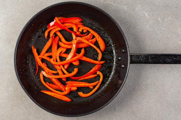 Die Paprika in einer großen Pfanne mit 2EL Pflanzenöl und 2 Prisen Salz bei starker Hitze ca. 4Min. anbraten. Dann 2EL Essig und 1TL Zucker unterrühren und die Paprika noch ca. 1Min. braten. Die Pfanne vom Herd nehmen.