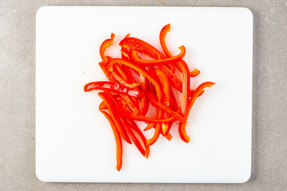 In einem großen Topf ausreichend gesalzenes Wasser für die Nudeln zum Kochen bringen. In einem Wasserkocher ca. 1L Wasser für den Spinat aufkochen. Die Paprika halbieren, entkernen und in dünne Streifen schneiden.