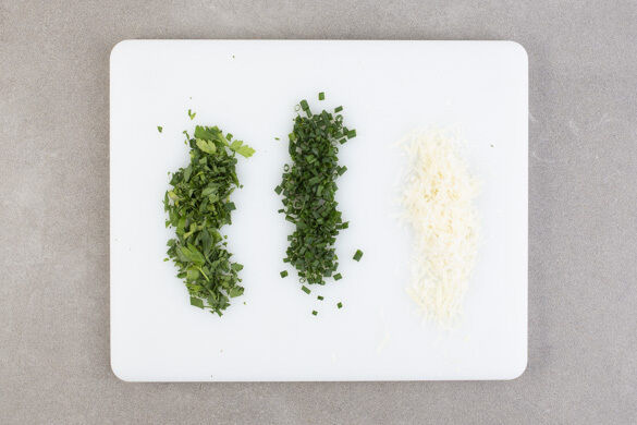 Nebenher die Petersilie samt Stängeln fein hacken. Den Schnittlauch in kleine Röllchen schneiden. Den Käse fein reiben.