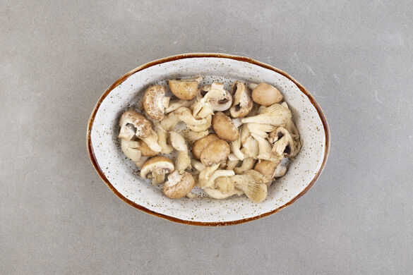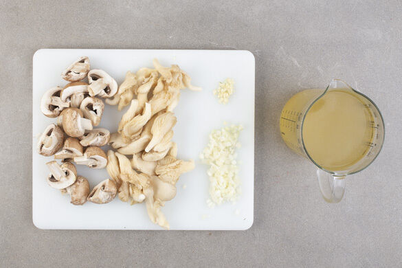 Den Backofen auf 220°C (200°C Umluft) vorheizen. Die Champignons ggf. säubern und halbieren. Die Austernpilze voneinander trennen. Die Zwiebeln und den Knoblauch schälen und fein würfeln. Das Brühgewürz in 1,5L heißem Wasser auflösen.