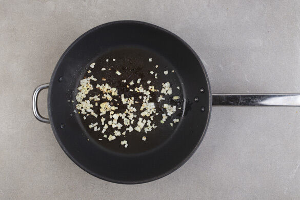 Die Zwiebeln in einer großen Pfanne mit 2EL Olivenöl und 1 Prise Salz bei mittlerer Hitze 3–5Min. glasig braten.