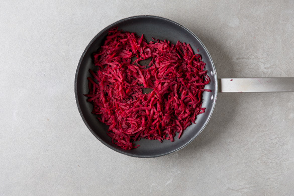 Die Rote Bete in einer mittelgroßen Pfanne mit 1EL Olivenöl bei mittlerer Hitze 5–6Min. anbraten, bis die Flüssigkeit verdampft ist. Mit Salz und Pfeffer würzen.