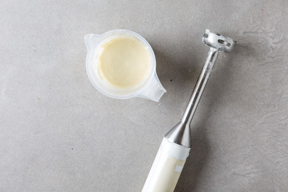 Den Feta mit der Crème fraîche, den Eiern, dem Meerrettich, 1TL Salz und 1 kräftigen Prise Pfeffer cremig pürieren.