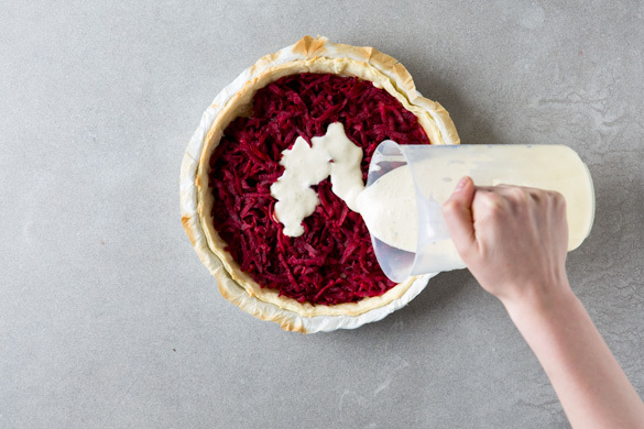 Die Rote Bete auf dem Teigboden verteilen und mit der Fetacreme begießen. Tipp: Über die Rückseite eines großen Löffels gießen, damit sich die Füllung nicht mischt. Die Temperatur des Ofens auf 180°C (160°C Umluft) reduzieren und die Quiche 15–20Min. backen, bis die Füllung am Rand goldbraun und in der Mitte fest ist.