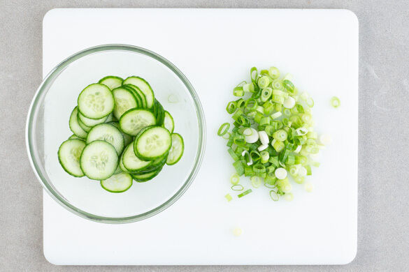 Die Limetten halbieren und auspressen. Die Gurke in dünne Scheiben schneiden und mit 1–2EL Limettensaft und 2 Prisen Salz vermengen. Die Lauchzwiebeln in dünne Ringe schneiden.