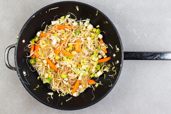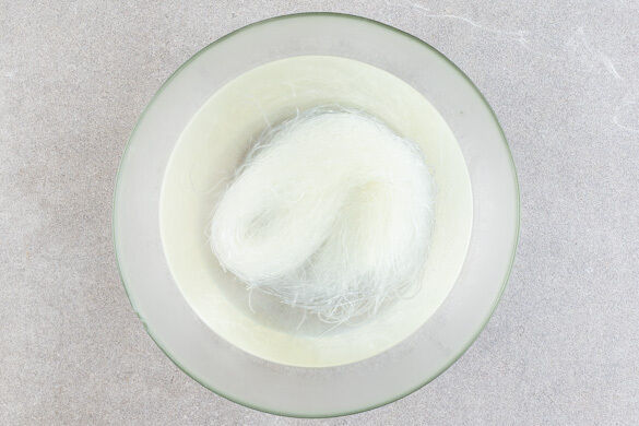 Die Nudeln mit dem kochenden Wasser übergießen und 3–5Min. ziehen lassen. In einem Sieb kalt abspülen und abtropfen lassen.