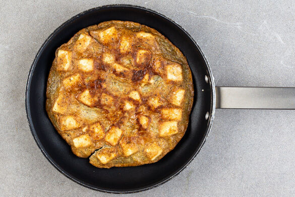 In einer mittelgroßen Pfanne 1EL Pflanzenöl bei mittlerer Hitze erwärmen. Die Tofu-Ei-Mischung hinzugeben und abgedeckt ca. 12Min. garen. Die Oberfläche des Omeletts soll noch nicht ganz fest sein. Die Pfanne mit einem Teller bedecken, Pfanne und Teller mit Topflappen festhalten und das Omelett auf den Teller stürzen. Dann wieder in die Pfanne gleiten lassen und noch 2–3Min. garen.