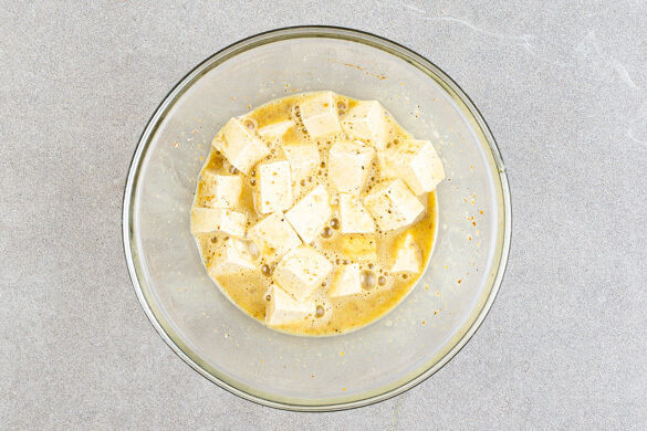 Den Tofu mit etwas Küchenkrepp trocken tupfen und in 1–2cm große Würfel schneiden. Die Eier mit der 1/2 des Currypulvers und 1TL Salz verquirlen, dann den Tofu untermischen.