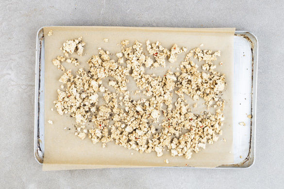 Den Tofu mit Küchenkrepp trocken tupfen und mit den Fingern zerbröseln. 1–2EL Pflanzenöl mit 1/3 des Ingwers, 1/3 des Knoblauchs, der 1/2 der Chili, 1/3 des Sesams und der 1/2 der Sojasauce gut verrühren und mit dem Tofu vermengen. Den Tofu auf einem mit Backpapier ausgelegten Blech verteilen, mit Salz und Pfeffer würzen und im Ofen ca. 15Min. knusprig rösten.