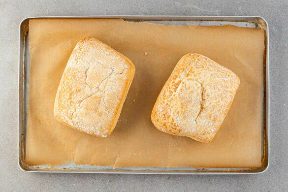 Die Brötchen auf einem mit Backpapier ausgelegten Backblech im Ofen 5–6Min. knusprig aufbacken.